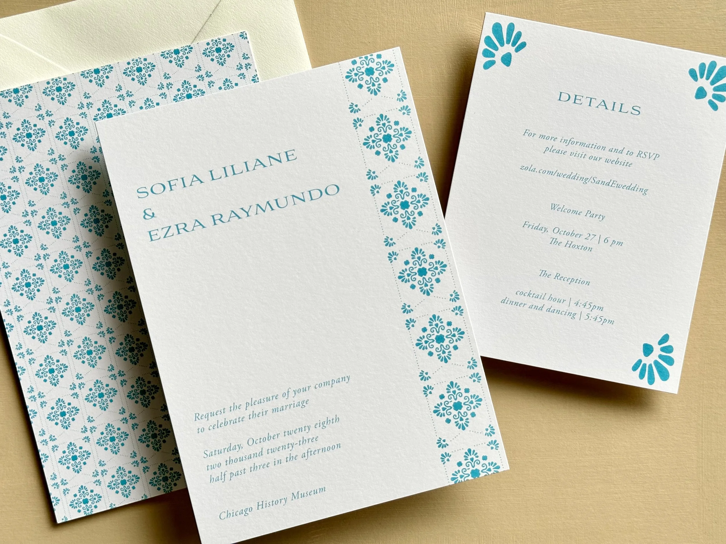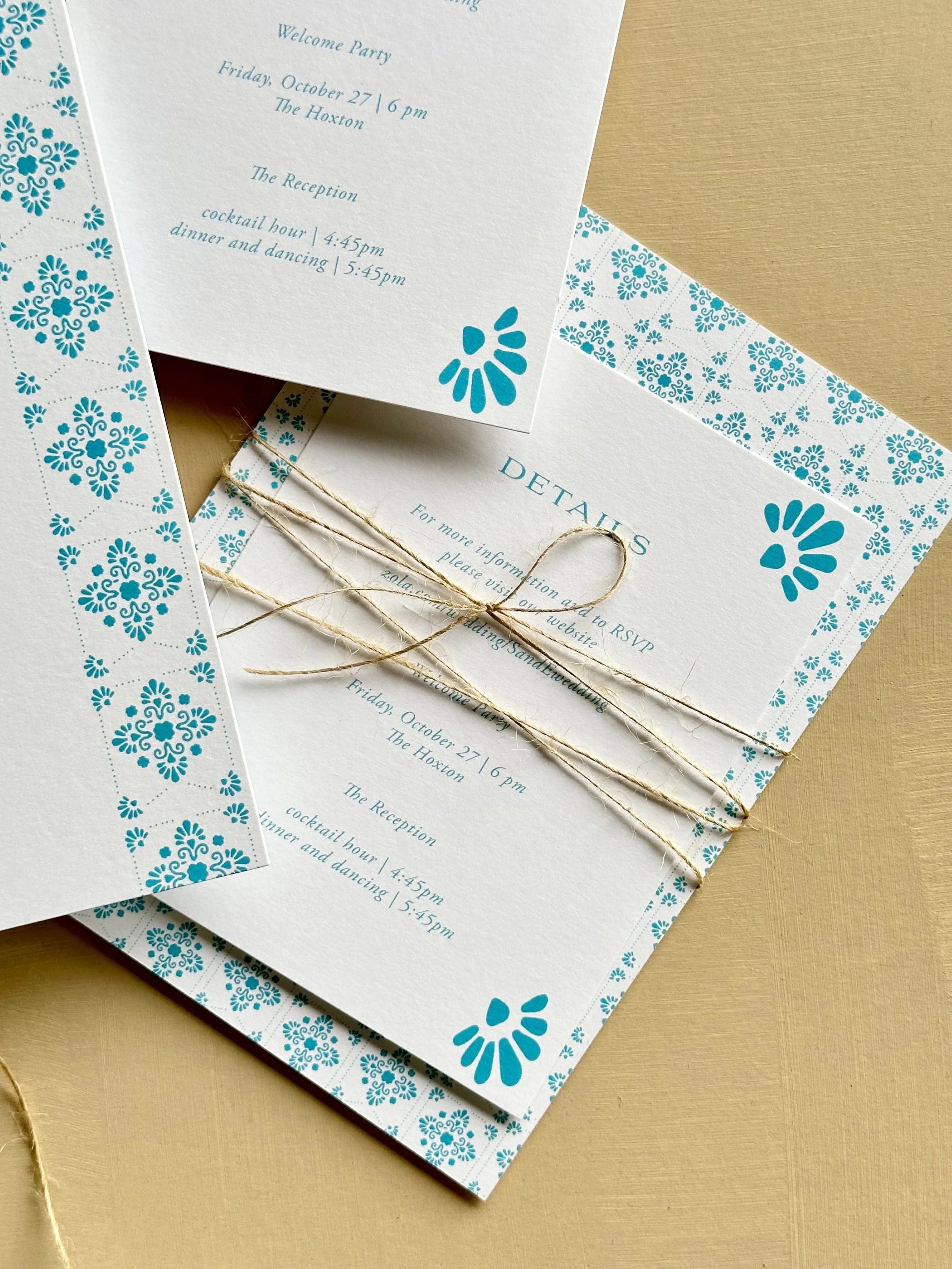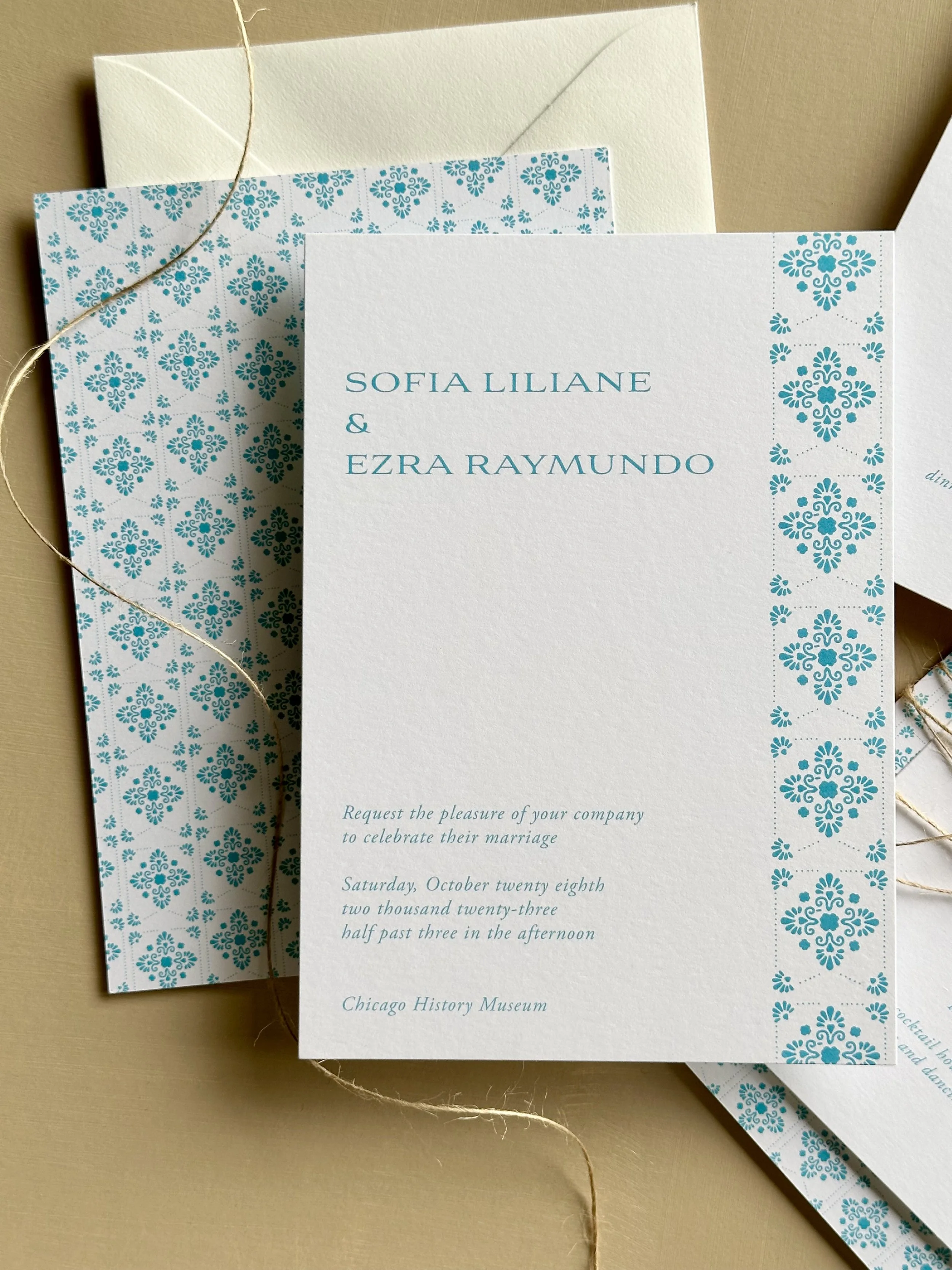 This suite has a beautiful tile pattern that we just love! Think bright spring colors on a unique double sided invitation card to give the tile pattern a beautiful moment.